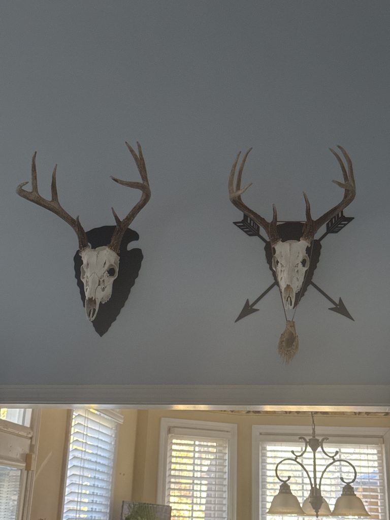Arrowhead with arrows European skull mount hanger with deer skull at an angle.